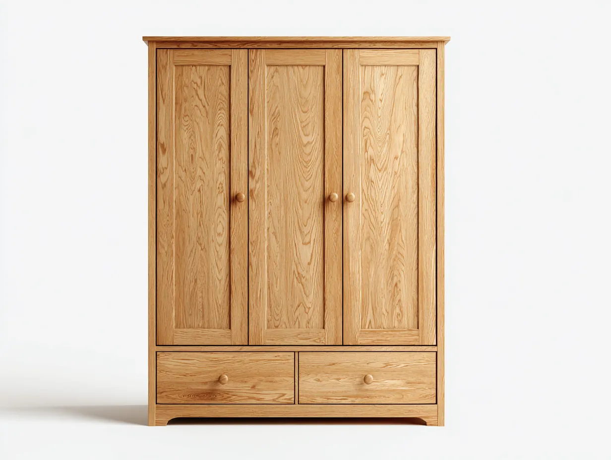 Dieser Kleiderschrank mit drei Türen bietet eine funktionale und zugleich stilvolle Lösung für die Aufbewahrung von Kleidung und Heimtextilien. Die natürliche Eichenoptik verleiht dem Möbelstück eine warme Ausstrahlung und passt gut in Schlafzimmer oder Ankleidebereiche. Das klassische Design unterstützt eine ruhige Raumwirkung und fügt sich harmonisch in verschiedene Wohnstile ein.