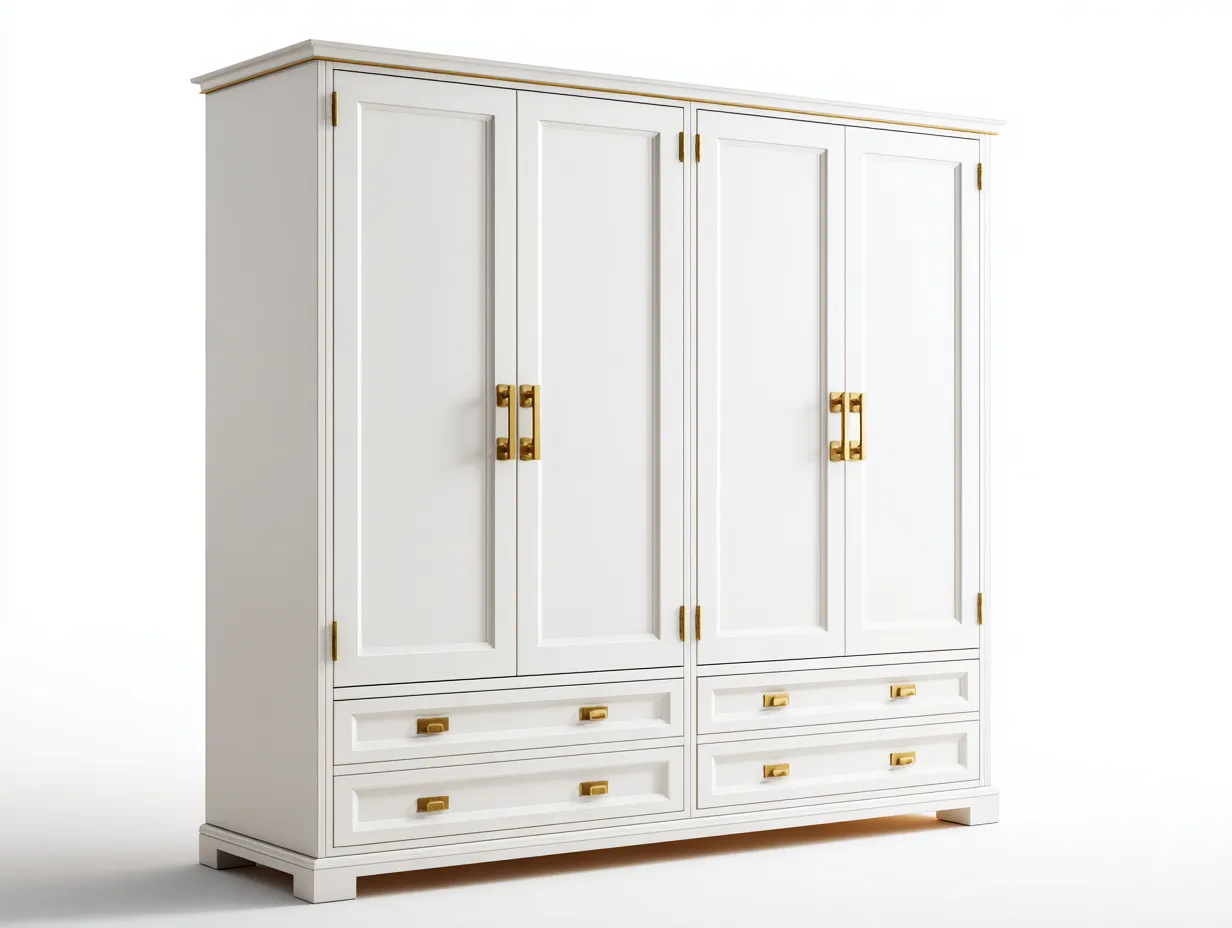 Die vier Türen ermöglichen einen komfortablen Zugang zum Innenbereich und schaffen ausreichend Platz für Kleidung und Heimtextilien. Die Schubladen im unteren Bereich bieten zusätzlichen Stauraum für kleinere Gegenstände und unterstützen eine übersichtliche Organisation im Alltag.