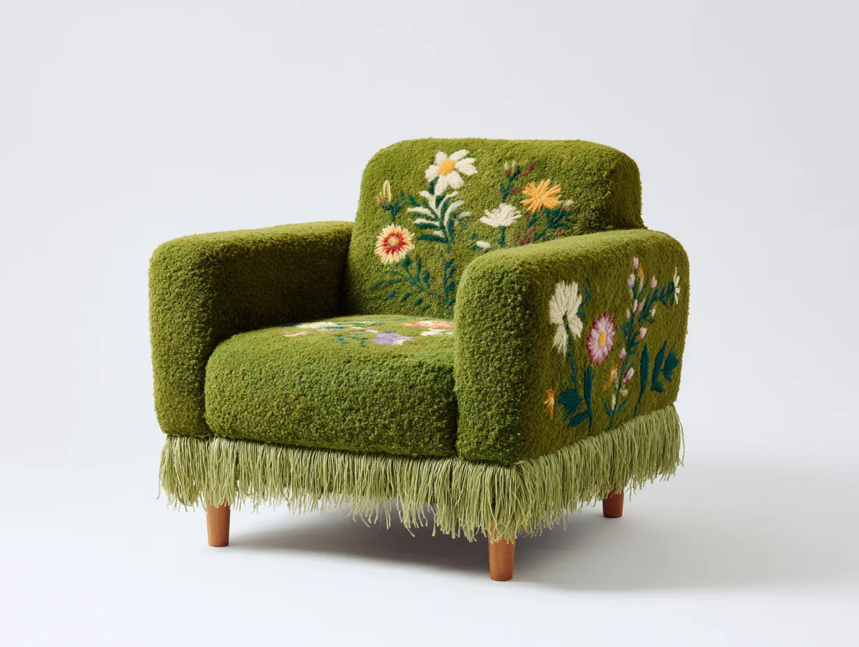 Dieser Stoffsessel kombiniert eine weiche Oberflächenstruktur mit floralen Stickereielementen und verleiht Wohnräumen eine dekorative und gemütliche Atmosphäre. Die grüne Farbgebung und die floralen Details sorgen für einen natürlichen Charakter und machen den Sessel zu einem stilvollen Akzent für Wohnzimmer, Leseecken oder entspannte Sitzbereiche.
